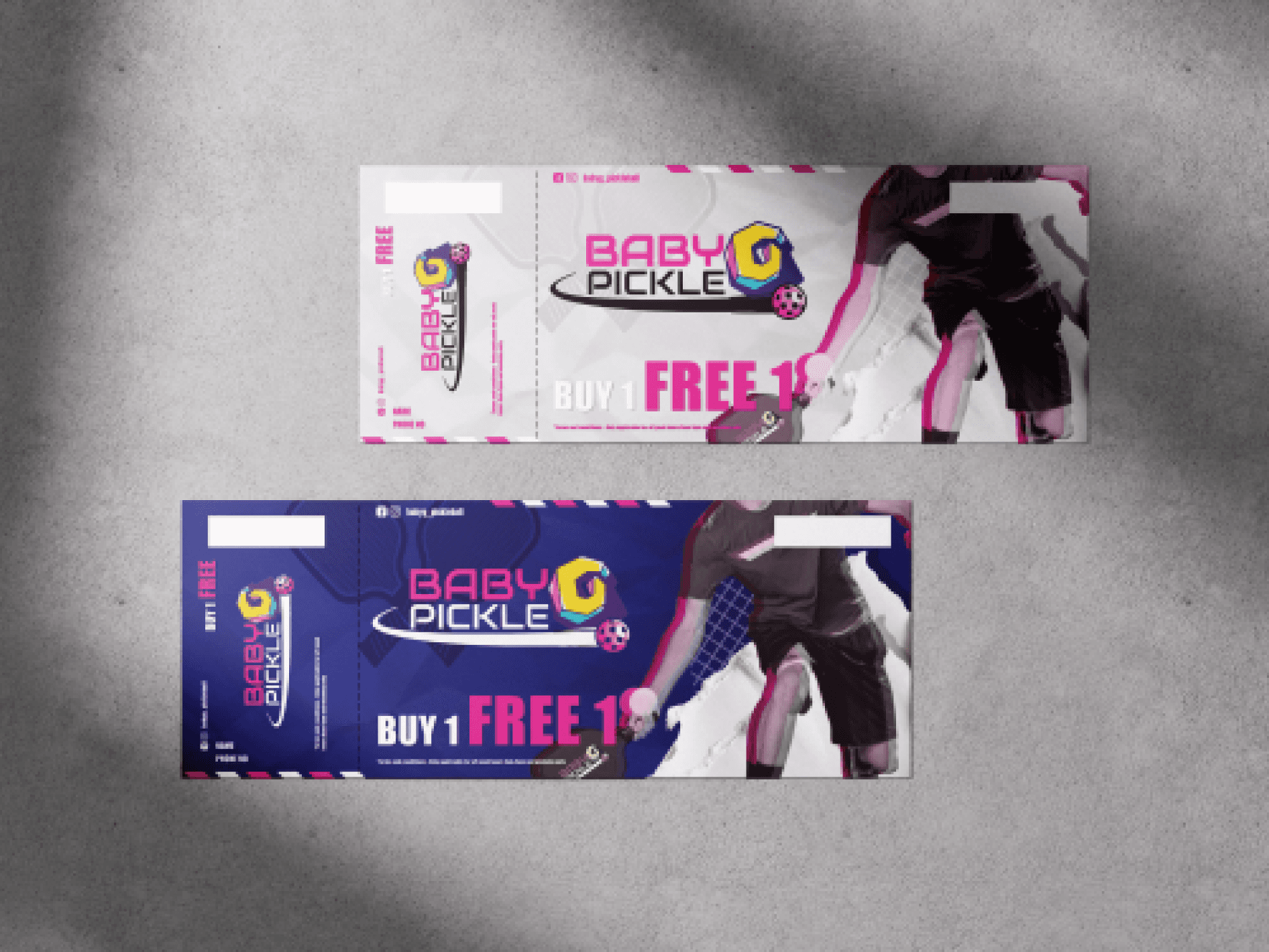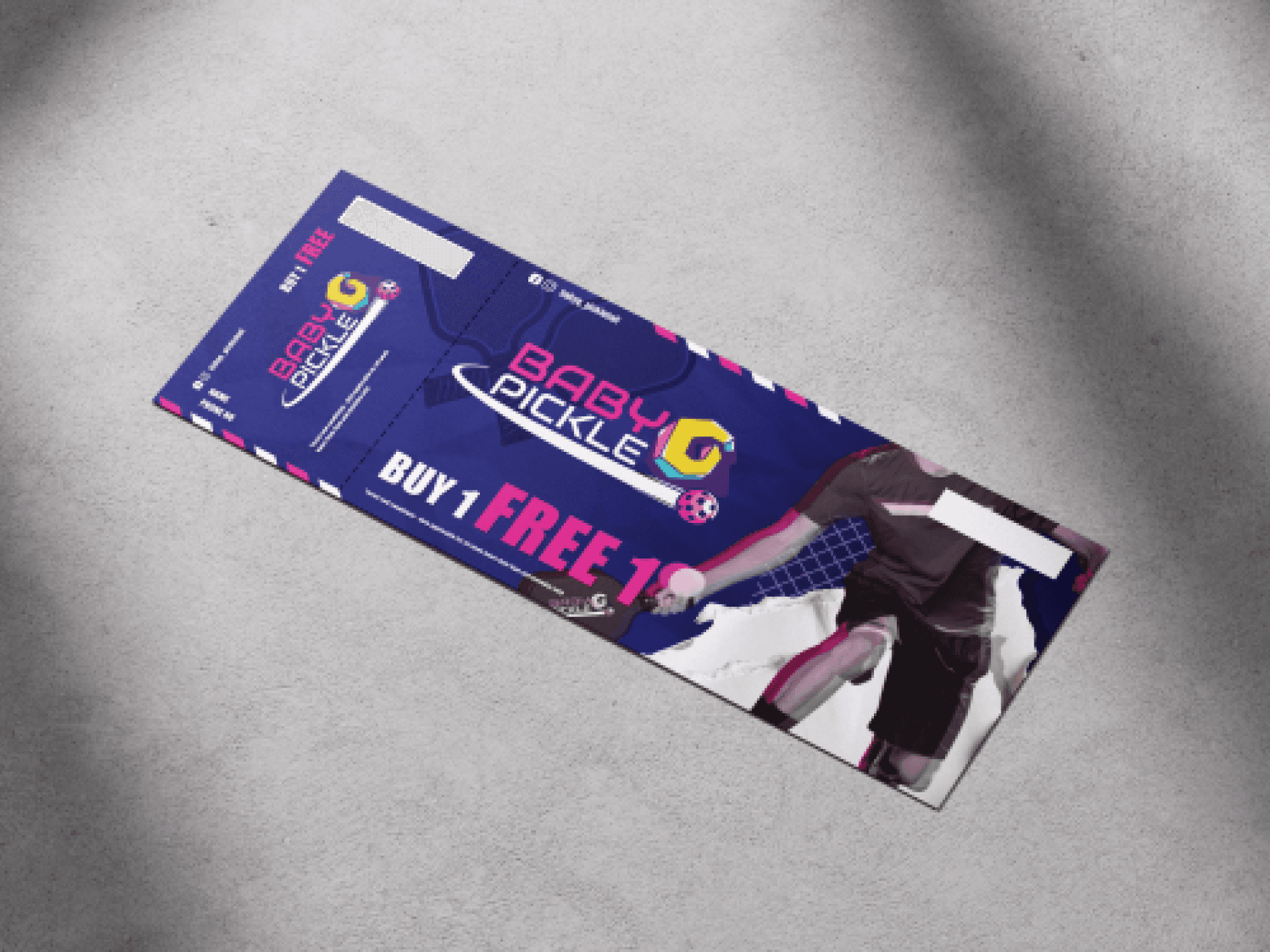 A vibrant and playful ticket design for Baby Pickle, capturing the energy, fun, and excitement of the game. Bold colours, sporty elements.